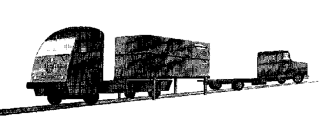 [315] Das Prinzip, ein Sattelauflieger, den man als "nahezu bimodal" bezeichnen könnte, da er zwar sowohl auf Straßen als auch auf Schienen fahren kann, jedoch das Eisenbahnfahrgestell nicht selbst mitführt, wird auch unter dem Namen Trailerzug vermarktet. Vgl. z. B. Kuhla (1990).