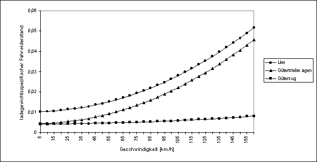 Ein Gütertriebwagen, so wie er oben skizziert wurde, entspricht weitgehend einem Lkw, der jedoch mit Eisenbahnrädern ausgestattet ist. Ein solches Fahrzeug hat also den Rollwiderstand eines Eisenbahnfahrzeugs und den Luftwiderstand eines Lkws (vgl. Tabelle 8). Da der Luftwiderstand von der Fahrgeschwindigkeit abhängig ist, kann ein Wert für den Fahrwiderstand nur jeweils für eine bestimmte Geschwindigkeit [335] angegeben werden, als typischer Wert für den Güterverkehr wurden hier 80 km/h angesetzt.
