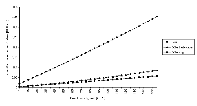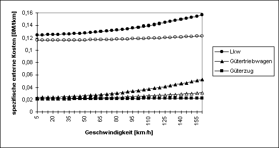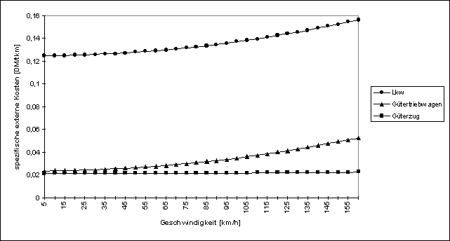 Man erkennt, daß der Einfluß der vom Fahrwiderstand abhängigen externen Kosten durch Luftverschmutzung zurückgegangen ist - an dem sichtbaren Unterschied in der Größenordnung der externen Effekte zwischen Straßen- und Schienenverkehr ändert sich nichts.